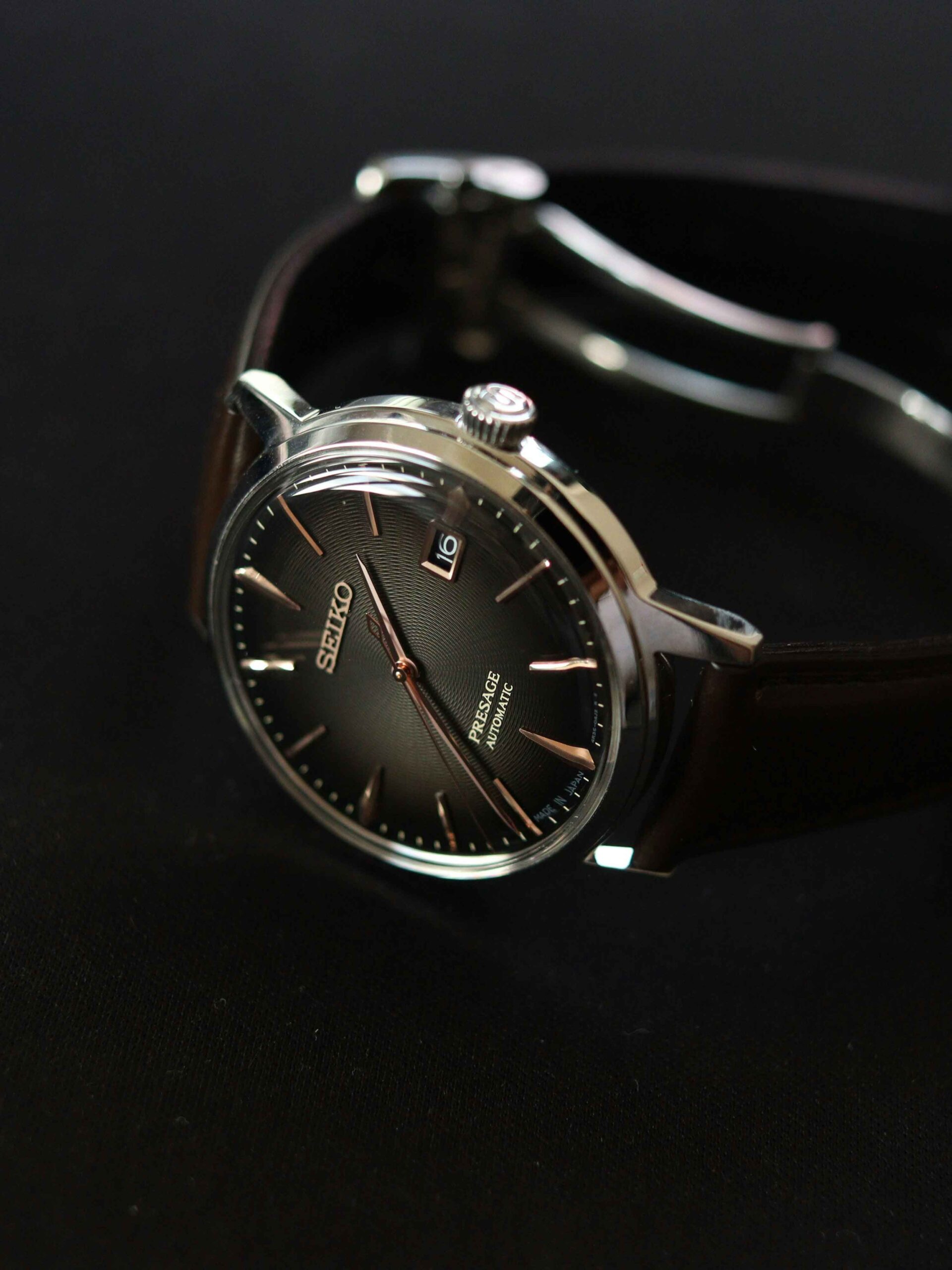 Elevate your style with this sophisticated chronograph watch featuring a sleek black dial, genuine leather strap, and precise timekeeping.